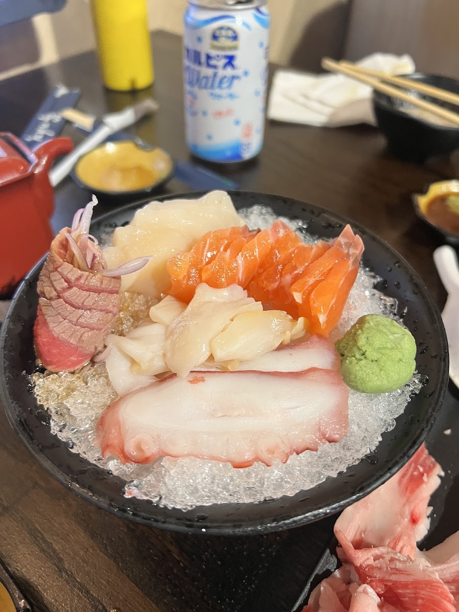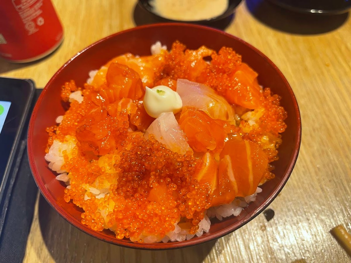 Seasonal choice of sashimi lay on a bed of sushi rice bowl, served with veggies and daily miso soup.