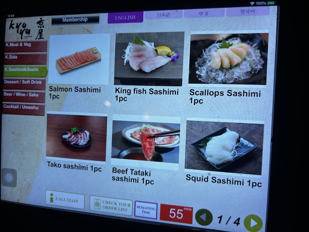 Salmon sashimi, king fish sashimi, tuna sashimi, scallops sashimi, scampi sashimi, surf clam, squid.